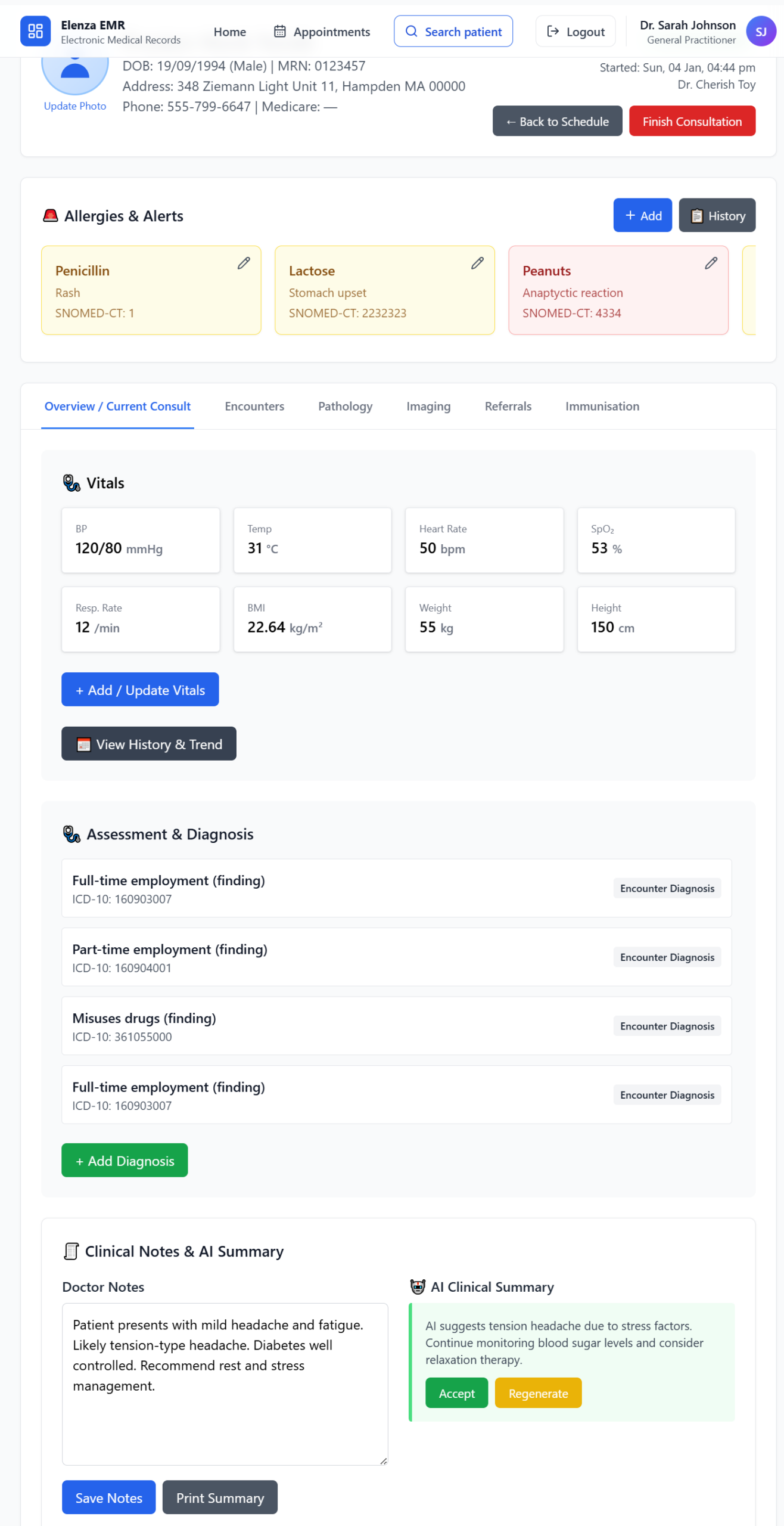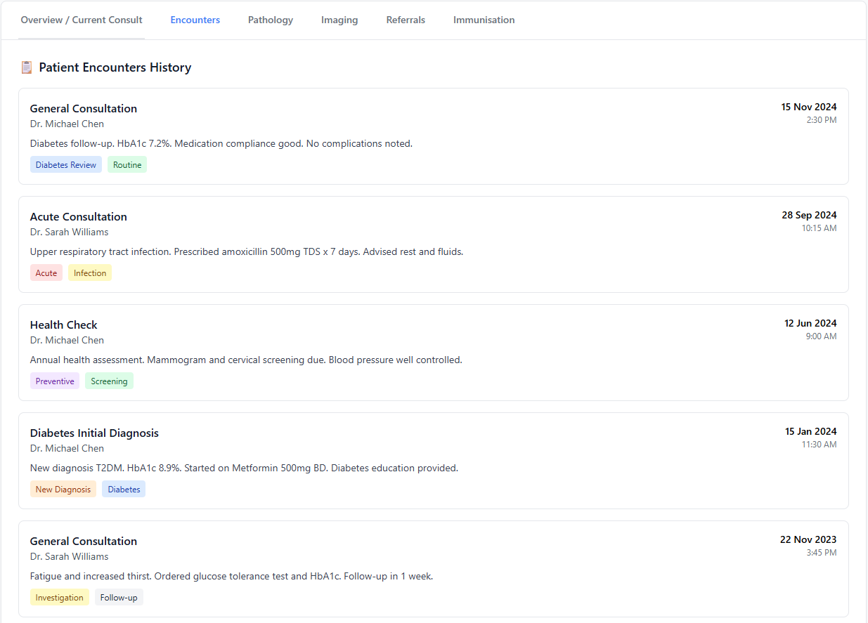 Every patient encounter is organised chronologically, with key findings, diagnoses, and results linked directly to each visit. Clinicians can quickly understand what happened, why it happened, and what needs follow-up β without searching through paper files or fragmented notes.