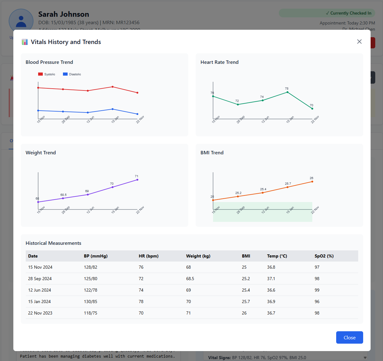 Patient vitals are recorded consistently and displayed over time, making trends easy to spot at a glance. Clinicians can quickly assess changes, identify early warning signs, and make informed decisions using reliable, structured data.